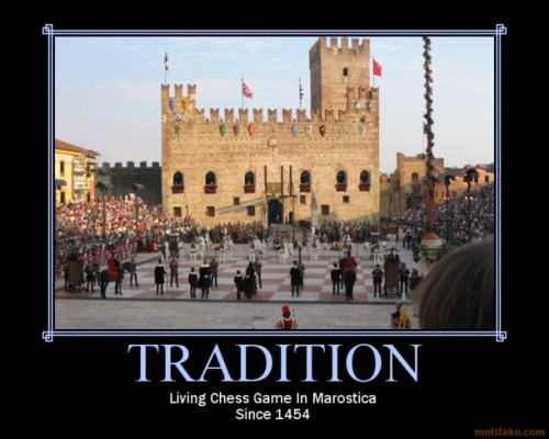 Every September in the Italian town of Marostica, the inhabitants play a game of living chess in the town’s checkerboard square. The tradition dates back to 1454, when this method was used to decide which of two young noblemen should have the hand of the daughter of the local notable. Not every chess piece is a person; some are police horses.